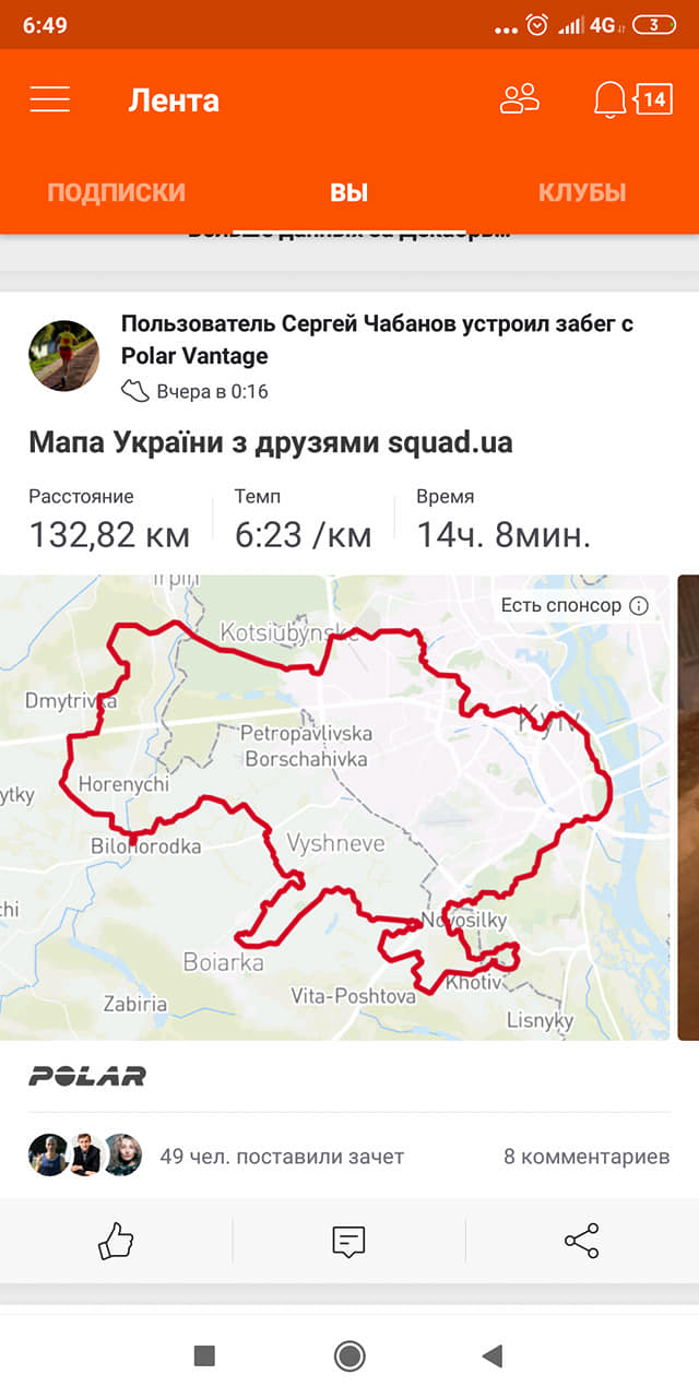 Вторая половина маршрута началась с приятной встречей рассвета и приезда Бубочки с Генютой на точку в 65км. Ребята нам привезли наши вещи, и вторую часть еды и накормили нас и обогрели чайком. Это очень придало сил. Понимание того, что половинка уже за плечами радовало. И в темпе 5:40 вновь погнали в сторону Ирпени. После рассвета бежалось легче хоть и на усталых ногах, т.к. зрение уже не напрягалось и не всматривался в очередную ямку. Но…на 90м км я вдруг осознал, что резко теряю силы и мне не хватит их даже дойти до дороги, а тогда мы были в лесу и до трассы еще 10км. Этот лес я уже знал и понимал, что и как. Отстал от ребят на 200м. Потом мы все остановились, и я признался в том, что мне не по себе и очень тяжело. И к моему удивлению все ответили так же, им тоже было капец, как трудно. Решили просто поесть гелей. Взбодриться. Благодаря Назарій Гнат Назарию, я съел гель с кофеином от Нутренд и сверху добавил СИС. Прилив сил реально ощущался. Это был углеводный голод. Протеиновый батончик не зашел купленный в ФОРЕ, от него сразу появилась изжога и это еще больше раздражало. Выбежав с леса, мы попали в магазин, где создали очередь из людей, которые купили двойной кофе и вафли, смазанные топленой сгущенкой. Это были самые вкуснячие вафли в жизни). Пол часа потеряли, но мы хотели их потерять все и сразу. Добежав до отметки 100км Еременко признался, что у него вчера была температура, и что реально сил нет продолжать. Я просто в шоке от того сколько же в этом парне сил. Он еще нам поможет в конце маршрута. Осталось нас трое и ультравелосипедист).