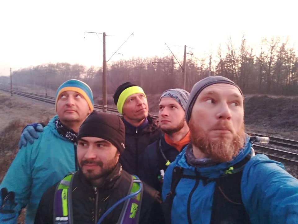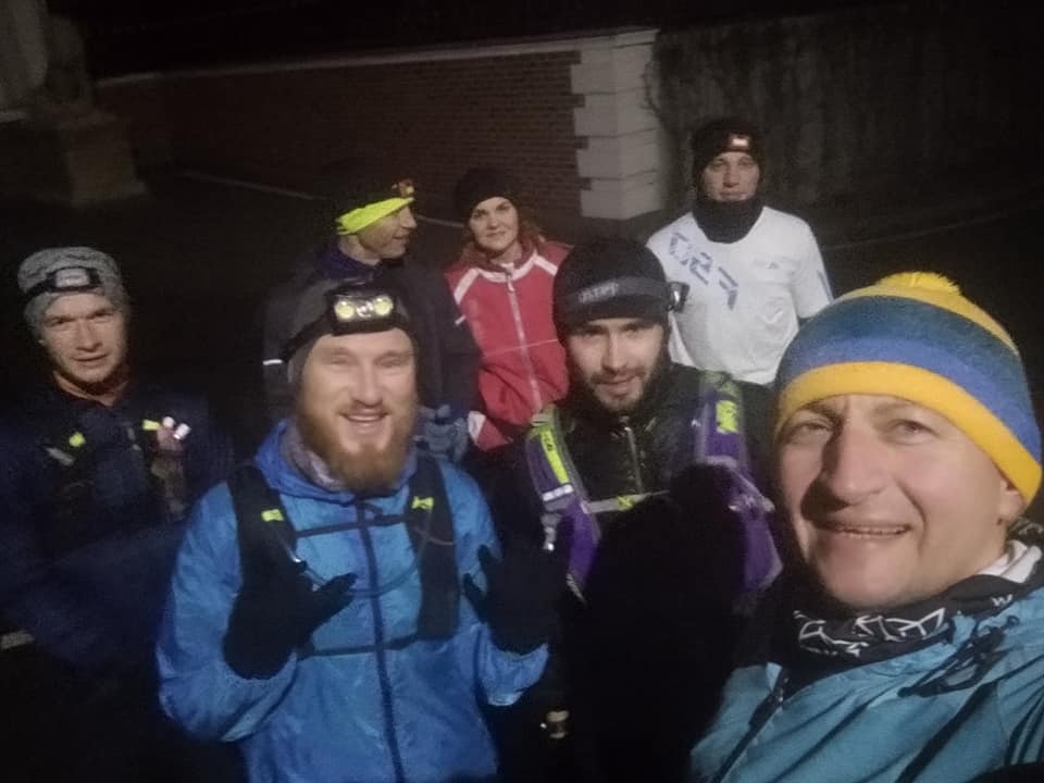 Собрались мы в 23;45 шестого декабря, возле баньки, которую заказали на 15:00 с расчетом, что будем бежать в темпе 6:00 всю дистанцию и потеряем около 2х часов на перекусы, переодевание, еду и т.д.(забегая наперед мы в баню так и не попали т.к. прибежали в 18:00 на финиш а баня в аккурат закончилась к этому времени). Выбежали на встречу с Михаилом Михайло Іванченко, который нас ждал в точке старта за мостом Патона возле китайского ресторанчика. Познакомившись, сняв первое видео мы погнали в сторону проспекта Науки. Бежалось легко, ноги свеженькие, адреналин играл по телу. Общались знакомились. Круто. Все идеально так, как и планировалось. Мы как сложенный организм. Если один останавливался – останавливались все. Были приколы в Голосеевском парке с ночными фонариками и падениями, но они незначительны. Пели песни, энергии море) Знали бы мы, что после 100км ее будет так не хватать). Все живы и здоровы. После парка усилился мороз с 0 до -4 и я накинул ветровку, что меня согрело и дало возможность не замерзнуть. В целом ночь прошла идеально. Маша и Евгений, которые бежали с нами в первой части маршрута, добежали до отметки 40км, как и планировали и пожелав нам успеха довольные поехали по домам. Осталось нас пятеро бегунов и Старцев. Уже на 40км мы поняли, что отстаем от графика на 1,5 часа т.к. не учли ночь, плохую видимость и то что организм в таких условиях начинает сбрасывать все, что мешает ему бежать в таких скоростях и условиях. Напомню, что остановился один, и все тоже остановились. И это нормально. С 40 км до 65км заметно прибавили и бежали по асфальту в среднем по 5:40 минут за км, дорога позволяла. Где-то на 60км я зацепился носком за камень и очень сильно упал и повредил колено. Реально думал, что сойду. Но поддержка друзей и желание закончить всю дистанцию было сильнее боли. Потеряли 20 минут на восстановление. Саша Данилюк Александр Данилюк меня вытаскивал на руках с дороги. Который после 65км решил не рисковать и не продолжать. Смена места жительства и перерыв в тренировках дали знать. Хорошо, что люди трезво оценивают свои силы и не мешают всем достигнуть цели. Рад знакомству и дельным советам по созданию забегов. Твой опыт и искренность бесценны, а постоянная улыбочка заставляет относиться ко всему как и игре! Обнявшись мы продолжили.